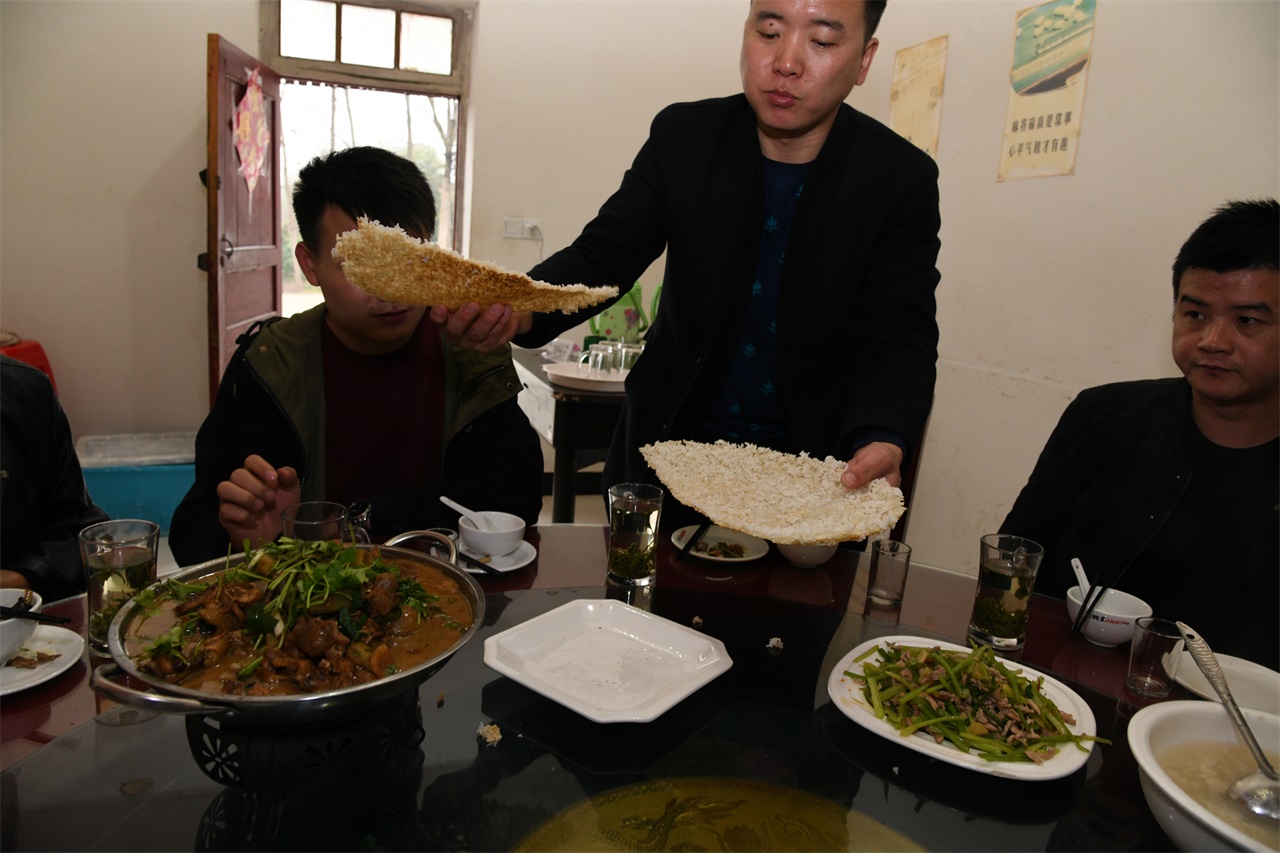 初冬时节,在河南信阳商城县双椿铺镇一座农家饭店里,今年50岁的杨春秀正在地锅里盛米饭,杨大妈蒸的米饭,会在锅底形成一个焦黄的锅巴,在给客人端米饭上桌的时候,这张锅巴会和米饭一起端上餐桌。