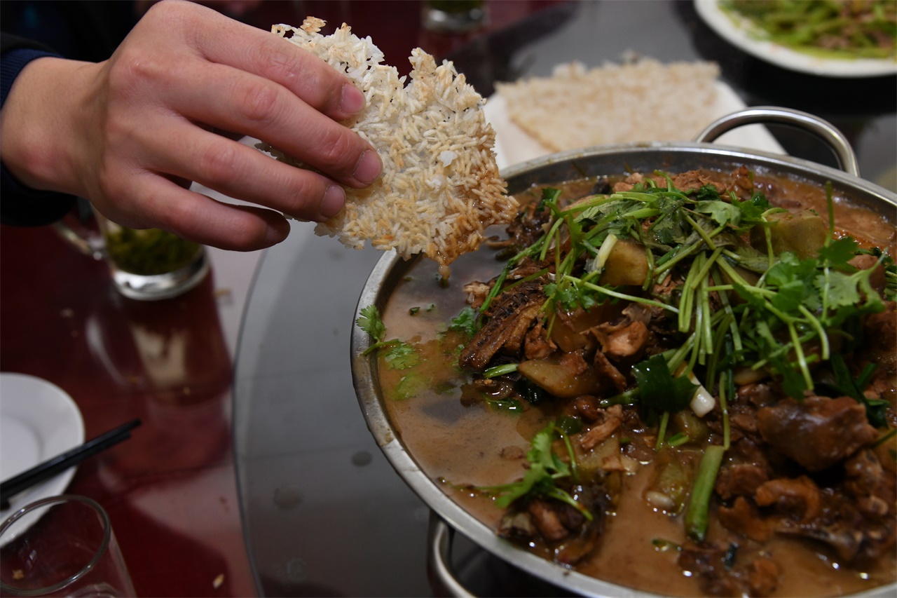 据杨大妈介绍,锅巴的吃法还不少,可以像这样蘸菜汤吃,还可以下油锅炸了吃,还可以在炒菜的时候“打底”。如今人们蒸米的方式变了,所以能吃到锅巴的机会也不多,很多人把这个当稀罕吃,每次来的时候都要点上一个。摄影记录|张春光