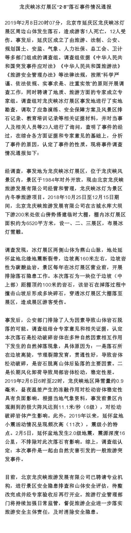 2月28日下午,北京延庆区发布了“龙庆峡冰灯展区‘2·8’落石事件情况通报”。通报中称,公安部门排除了人为因素导致山体岩石脱落的可能;调查组结合专家意见和相关证据,认定本次落石是松动破碎岩体在多种自然因素相互作用下发生的自然掉落现象。