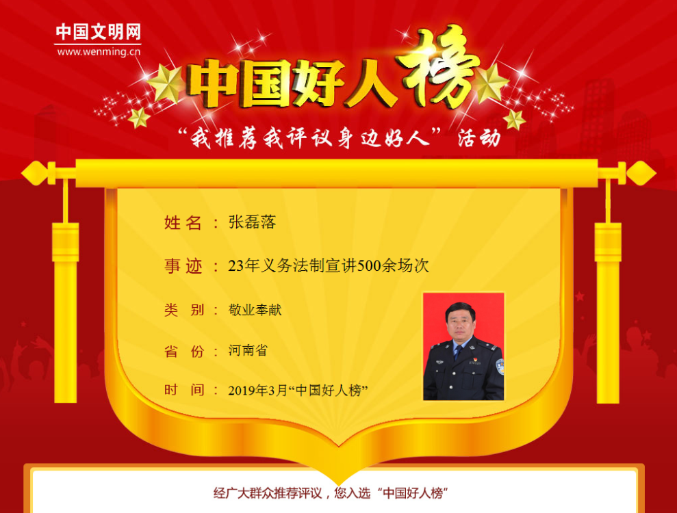 今年3月底,经广大网友推荐,网上投票等,张磊落成功入选敬业奉献类“中国好人”。“给群众做义务普法宣传,作为一名人民警察,这是我应该做的,没想到社会竟给了我这么大的荣誉!”获悉该消息后,张磊落淡淡一笑说。