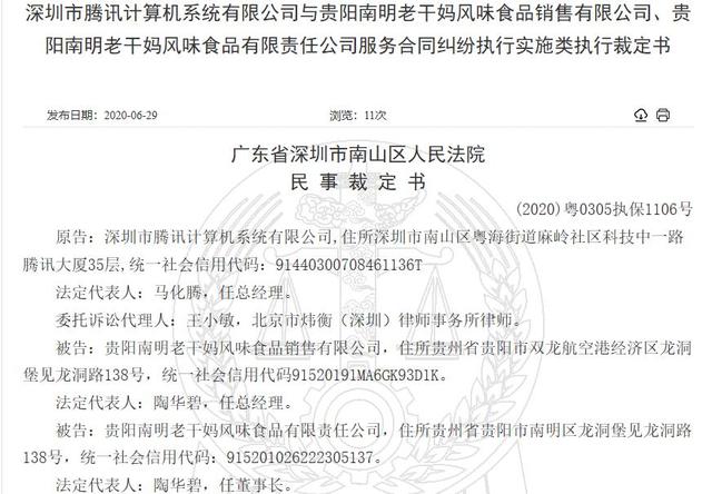 6月30日,从中国裁判文书网获悉,深圳市南山区人民法院发布一则民事裁定书,同意原告腾讯请求查封、冻结被告老干妈公司公司名下价值人民币16240600元的财产。