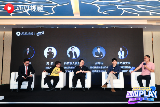 待四位嘉宾的交流和分享结束之后,史航与西瓜视频创作人孙思远、袁岚峰、张之瀛大夫对《职业创作人的乘风破浪之旅》这一主题进行了圆桌讨论,大家就“知识领域大IP的成长之路”等议题进行了分享。