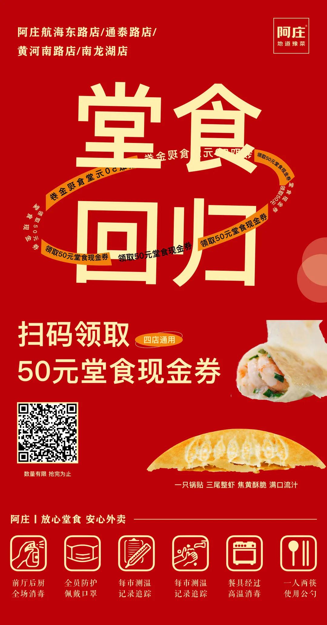 8月29日起,阿庄地道豫菜郑州3门店堂食回归,为回馈新老顾客,阿庄放出50万元堂食现金券免费送(扫描下方海报二维码即可领取)。同时,新人入会,除了大额现金券外,还可额外获赠2元享自制酸奶券一张,及小炒腰果鸡丁免费尝新券一张。