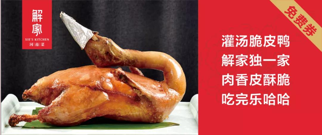 一重礼:到解家河南菜21家门店就餐,每桌即可免费享受一份价值98元的灌汤脆皮鸭。