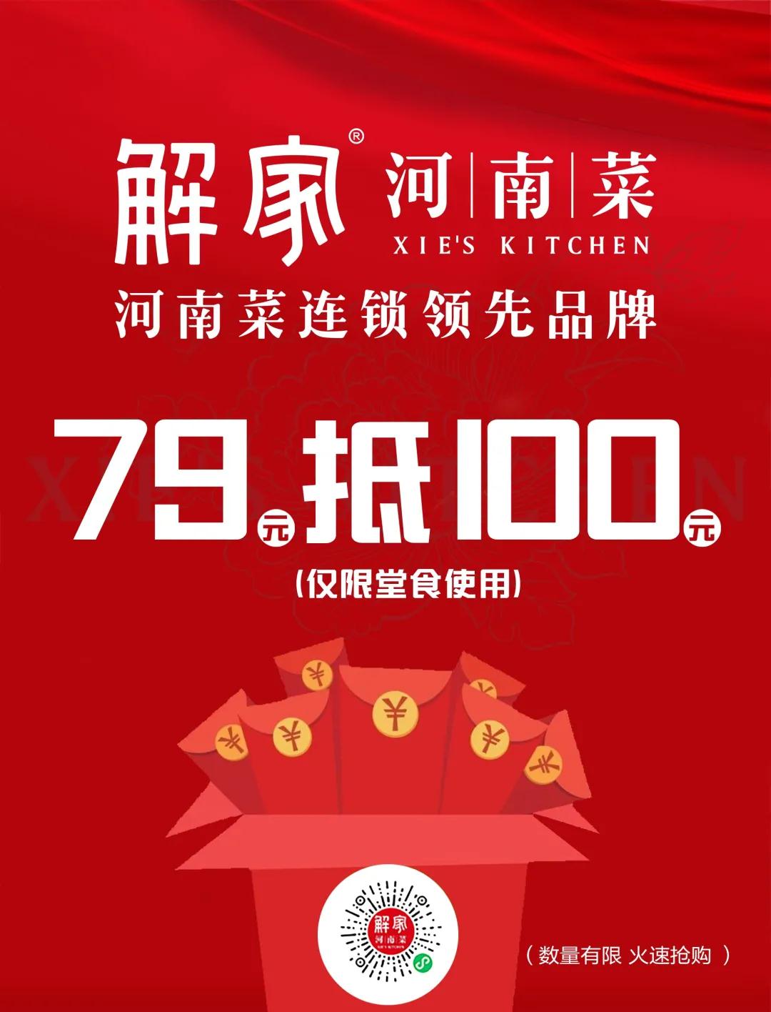 二重礼:堂食79元抵100元,限量5000份销售,可到解家商城和大众点评抢购(扫描海报二维码即可抢购)