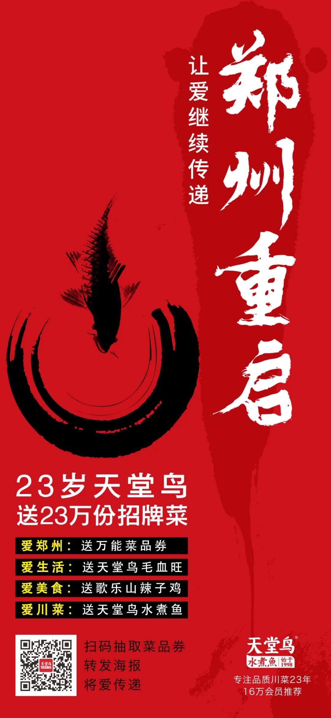 8月29日起,郑州市区5门店陆续恢复堂食,同时,作为扎根郑州23年的川菜品牌,致敬英雄、感谢郑州,拿出23万份招牌菜免费送出。市民可以扫描下方海报二维码,进入“天堂鸟水煮鱼”微信公众号,点击底部菜单“抽奖点我”,进入抽奖页面抽取最高价值139元的菜品券。