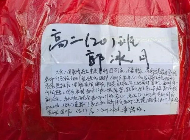 通过图片可以看出,这封信是写给该校高二(20)班的学生郭冰月的。11月9日,记者联系到高二(20)班班主任刘永亮老师,据其介绍,当时他也在现场当志愿者,当他看到了这包被褥的时候才发现袋子外面贴着一封手写的信。